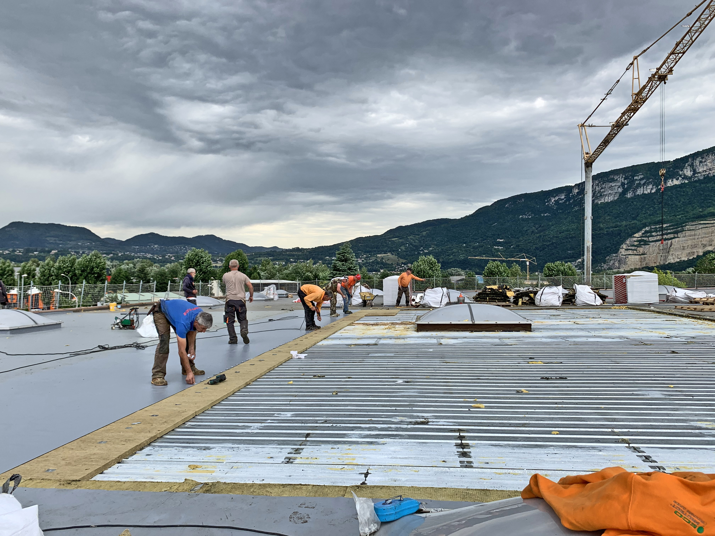 Nous avons été missionnés pour refaire l'étanchéité de la toiture d'un bâtiment industriel à Voreppe. L'étanchéité ayant déjà été refaite auparavant, il n'était pas possible de réaliser un "rechapage" : nous devions, selon les normes en vigueur, revenir au support en tôle d'acier nervurée (TAN) et donc, arracher la totalité du complexe existant (étanchéités et isolation). Nous avons ensuite remis en œuvre une étanchéité en PVC fixée mécaniquement au travers d'un isolant en laine de roche.