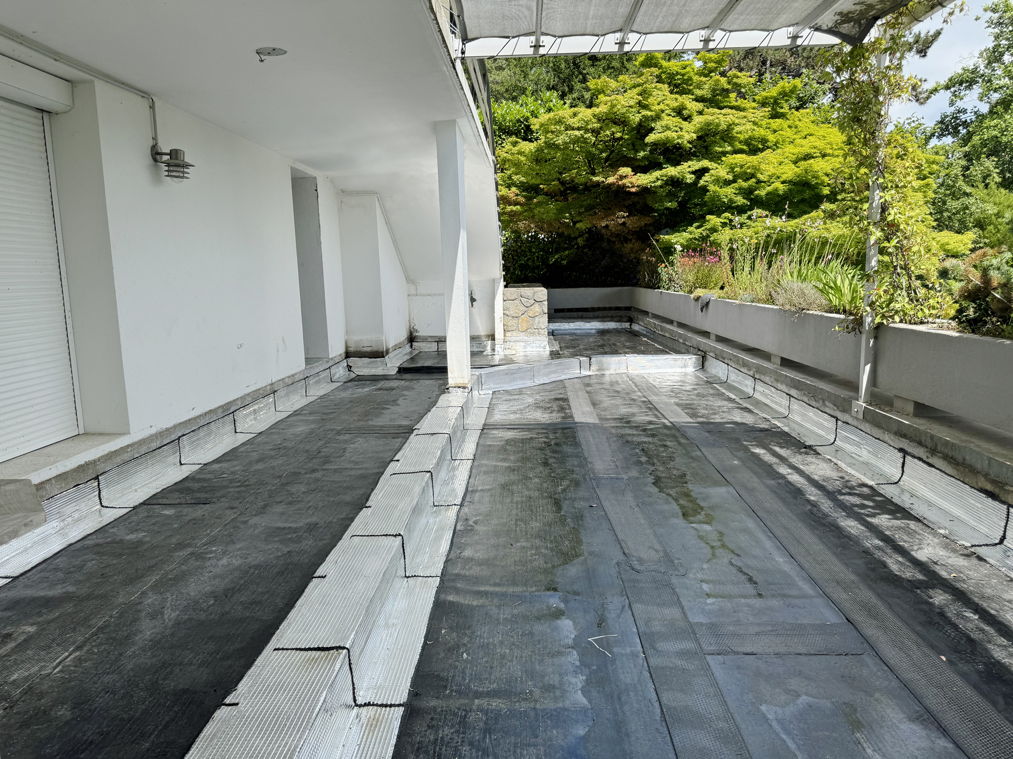 Démolition de l'ancien complexe (pierres, chape, résine) et réalisation d'un complexe d'étanchéité accessible avec dalles carrelage 80x80