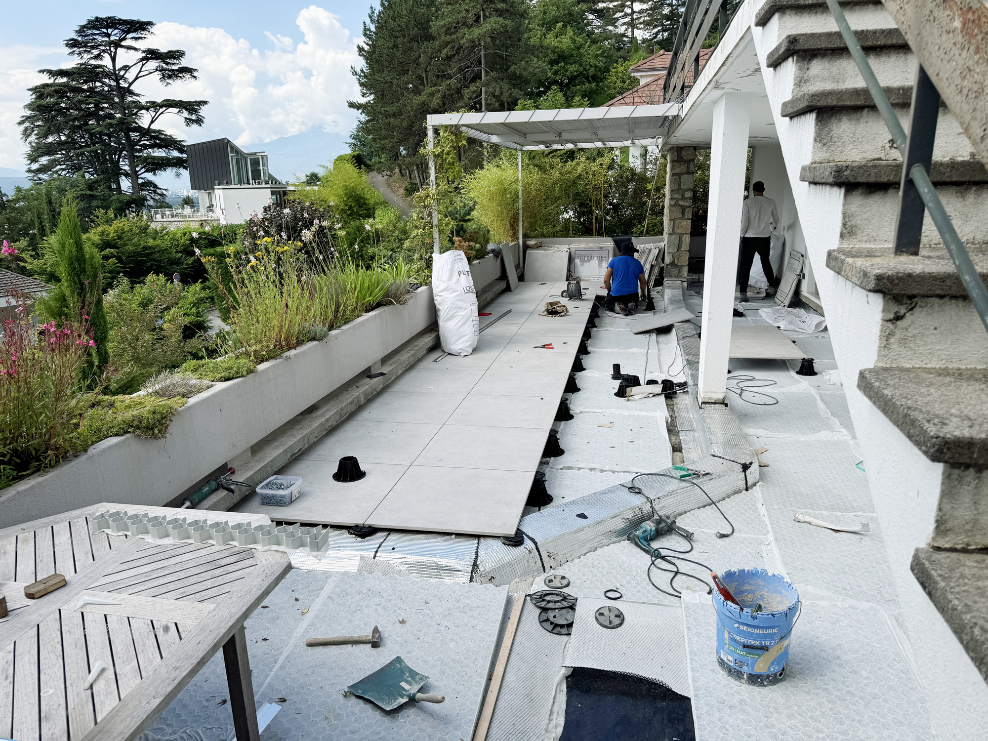Nous avons été sélectionnés pour la réfection complète d'une terrasse qui fuyait. Dès le début de la dépose, nous avons constaté que le complexe mesurait environ 30 cm d'épaisseur (pierres, béton, gravier et remblai). Nous avons tout évacué afin de retrouver le support béton d'origine. l'étanchéité à été réalisée mais nous avons dû compenser l'épaisseur du complexe que nous avions évacué afin de poser les dalles en grès cérame au même niveau qu'à l'origine. Pour cela, nous avons utilisé les modules en nid d'abeille NIDAROOF de chez SIPLAST recouverts d'un feutre géotextile afin de limiter la prolifération des moustiques.