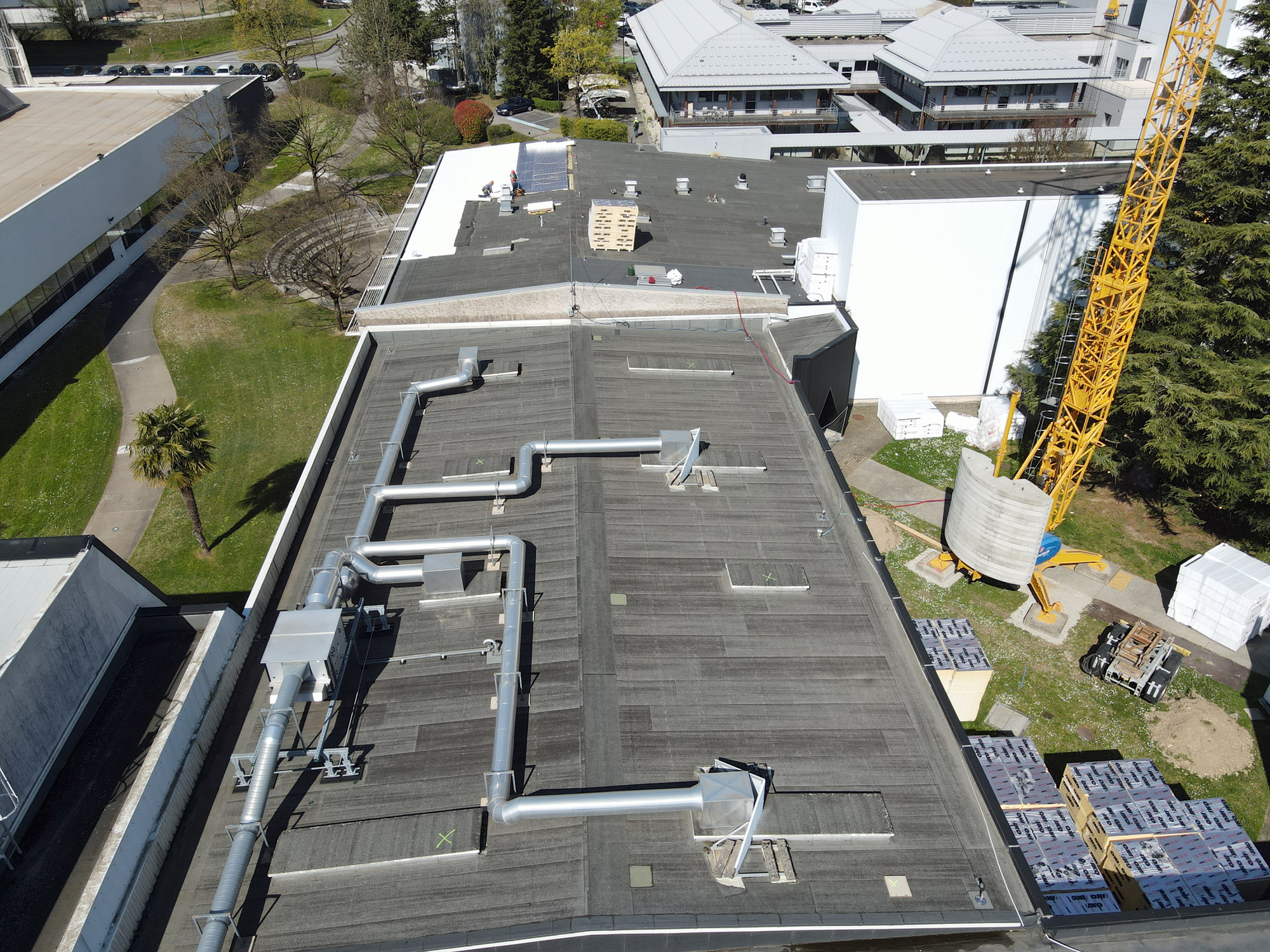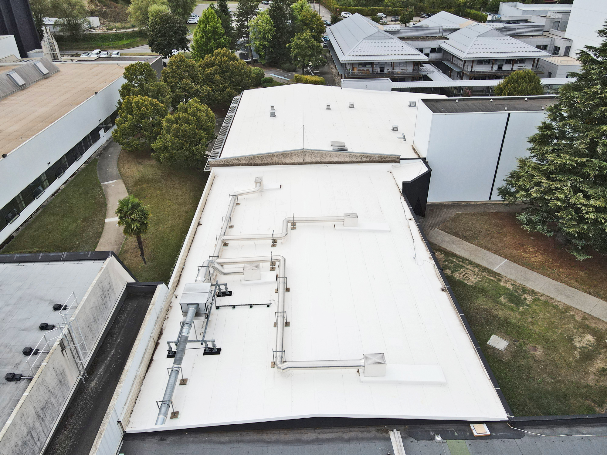 Réfection complète de l'étanchéité du bâtiment F avec amélioration thermique. Membrane refléchissante Evalon