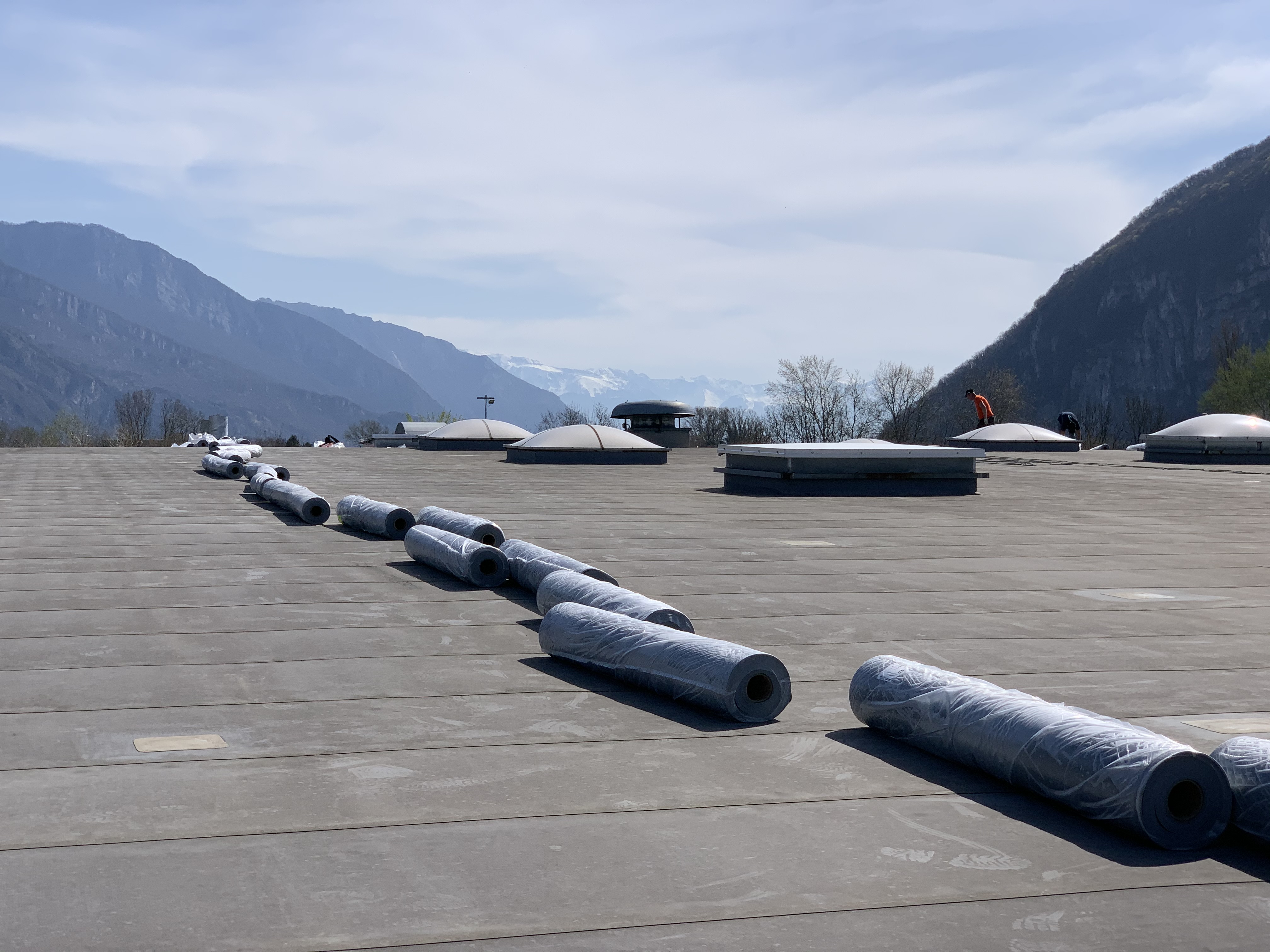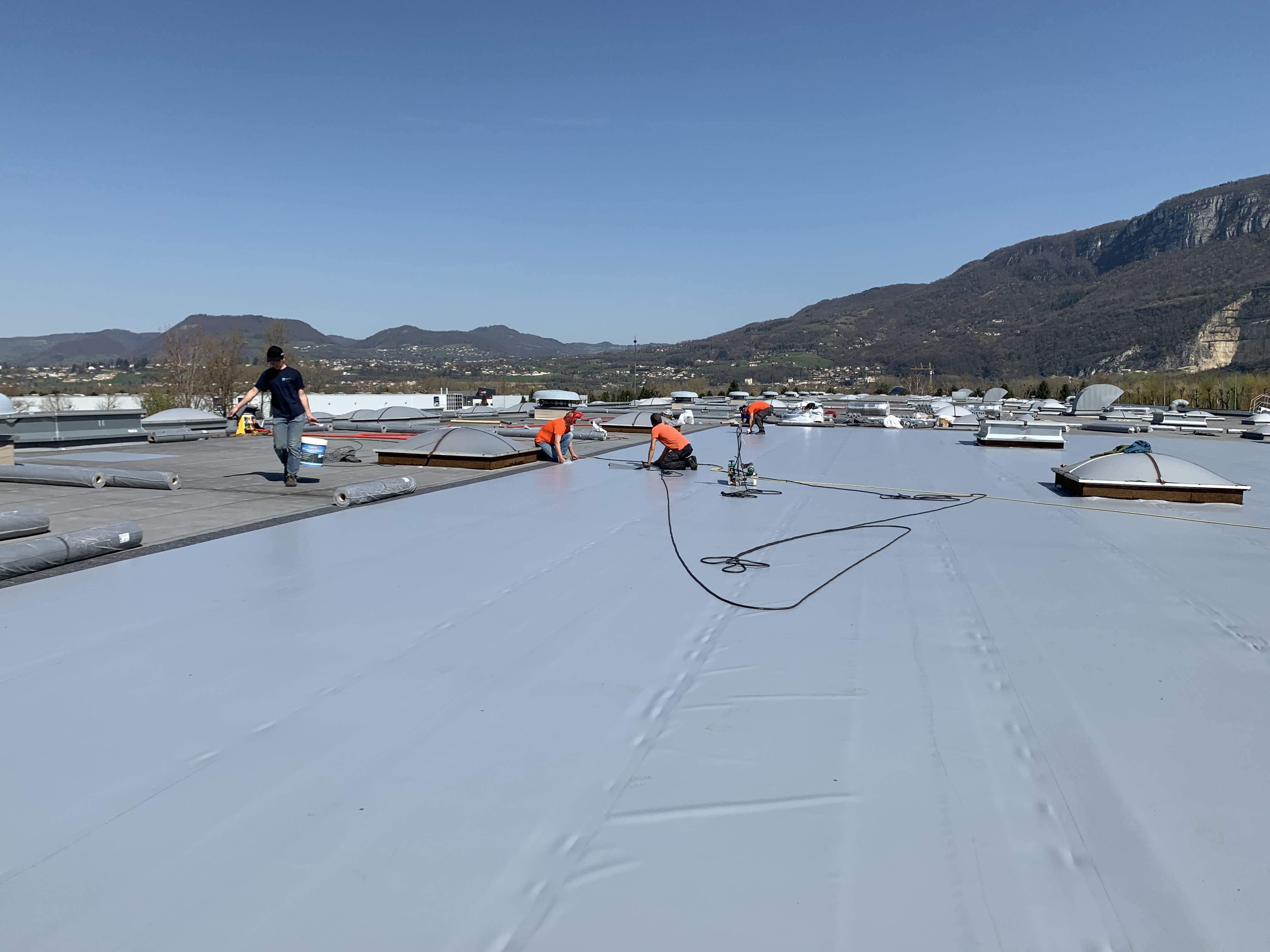 Nous avons été missionnés pour refaire l'étanchéité de la toiture d'un bâtiment industriel à Voreppe. L'étanchéité ayant déjà été refaite auparavant, il n'était pas possible de réaliser un "rechapage" : nous devions, selon les normes en vigueur, revenir au support en tôle d'acier nervurée (TAN) et donc, arracher la totalité du complexe existant (étanchéités et isolation). Nous avons ensuite remis en œuvre une étanchéité en PVC fixée mécaniquement au travers d'un isolant en laine de roche.