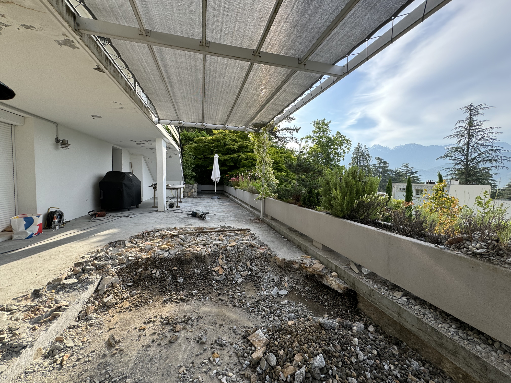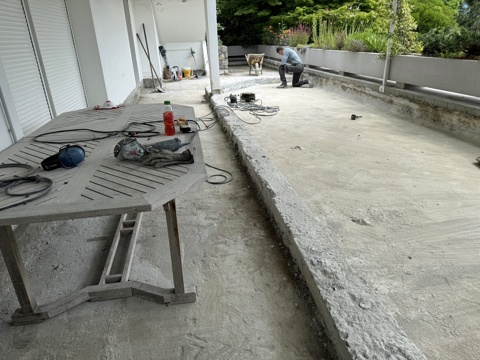 Démolition de l'ancien complexe (pierres, chape, résine) et réalisation d'un complexe d'étanchéité accessible avec dalles carrelage 80x80